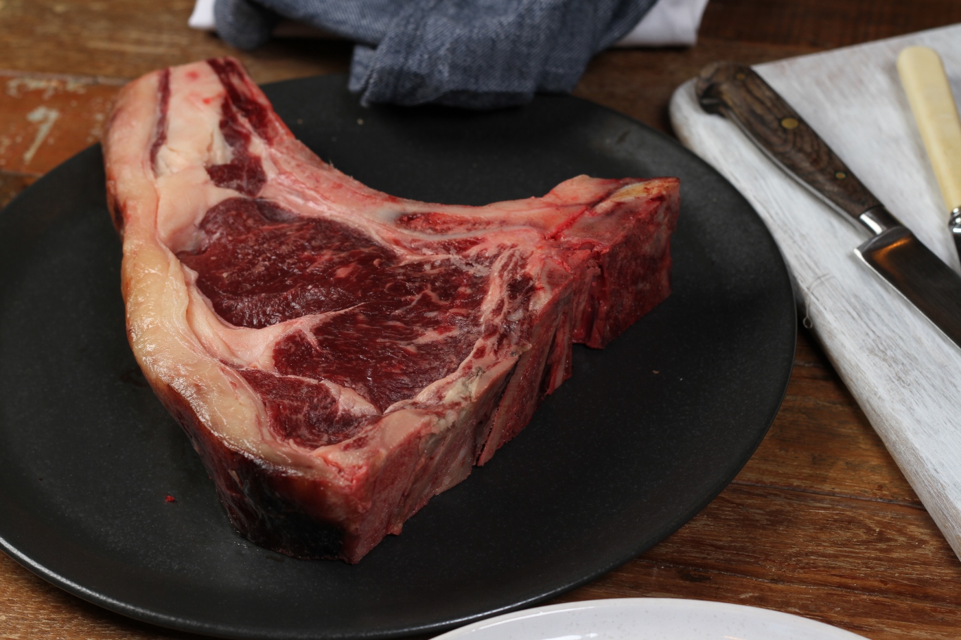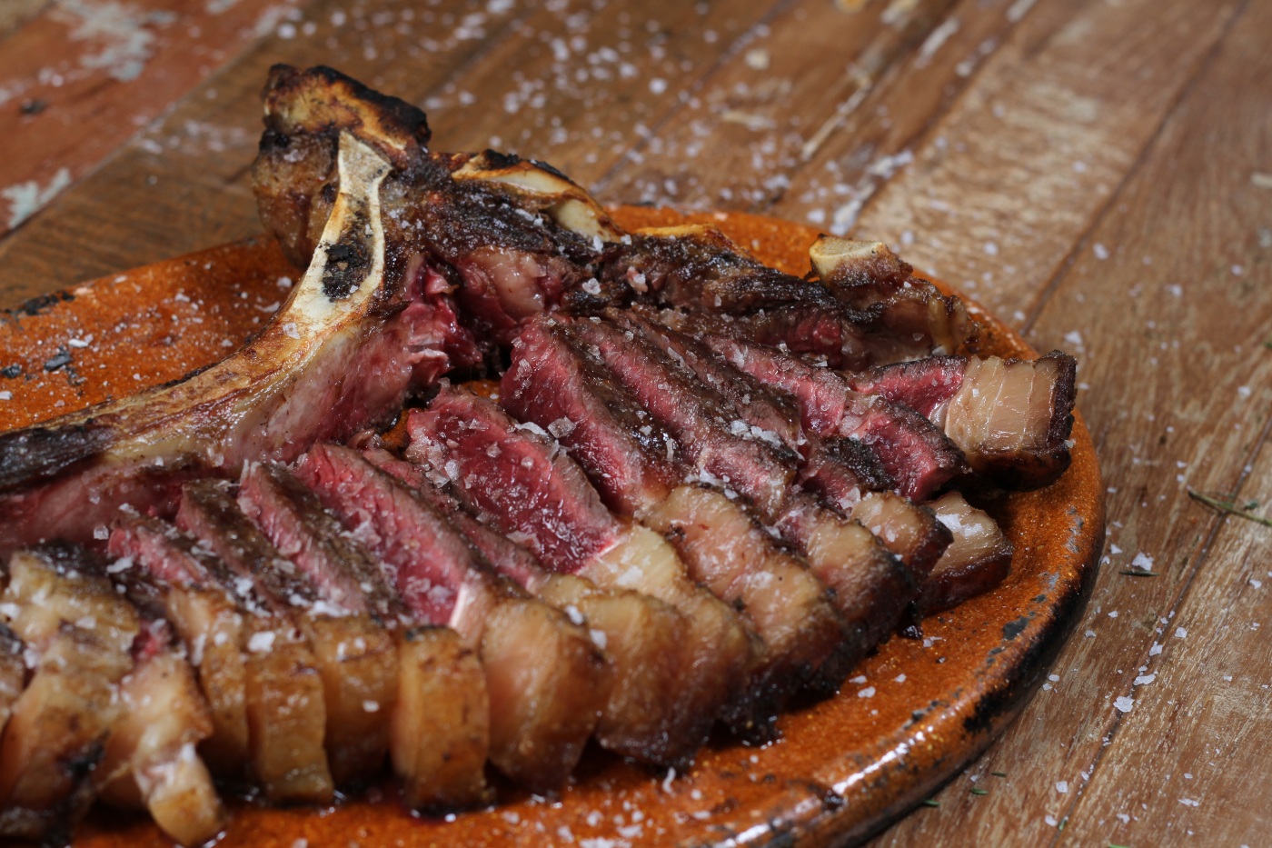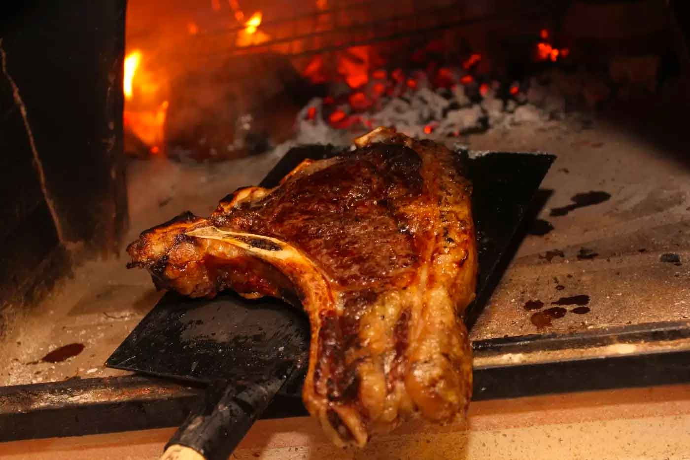 I recommend making the charcoal from kiln-dried hardwood such as oak, ash, beech, cherry, apple, pear, hawthorn or olive. Try burning some whole woody herbs such as rosemary or thyme over the charcoal just before I place the steak to cook. The herby smoke flavours the beef and provides a nice touch. Cooking times are also crucial when cooking a large rib steak. The thickness of a large rib steak tends to be between 6 and 10cm (2 and 4 inches) which means each side of the steak needs to be cooked for longer than normal. Rib steaks are always served rare to medium rare because of the higher amount of fat vs meat. If the steak is cooked for too long, the fat will contract and toughen the steak. It is also key to serve the steak thinly sliced on a hot plate. The plate will keep the beef warm, so the fat doesn’t go cold and once again contract.
