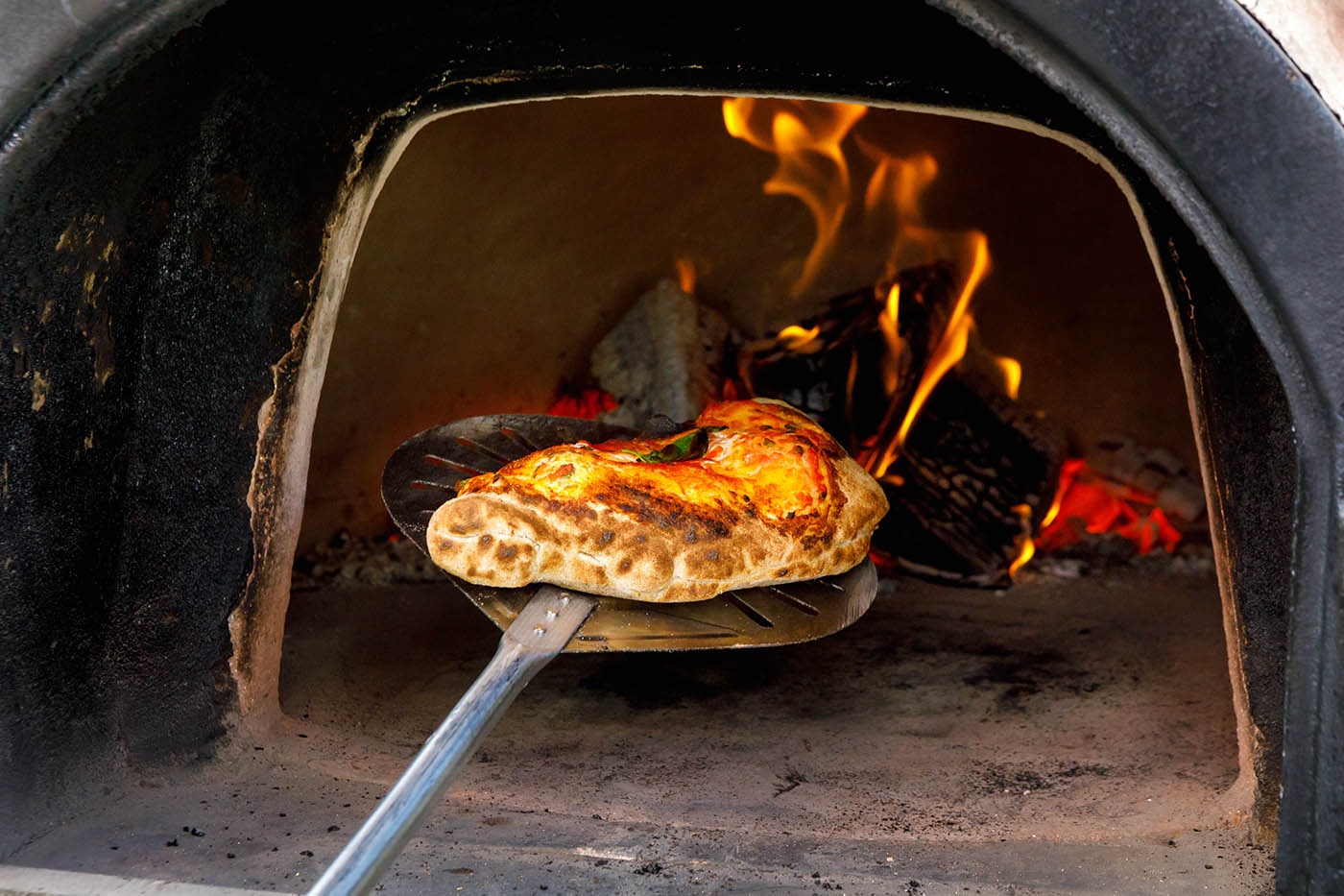 8. Using your pizza peel, slide your calzone into your Fuego oven. Using a turning pizza peel pick the calzone from the side, bring to the front of the oven and turn it round. Do not turn your calzone inside the oven, as it will pick too much ash. Keep your eyes on the calzone, as failing to turn regularly will result in very charred black edges. Calzone does take slightly longer than standard pizza to cook because of the folded dough, so allow a couple of extra minutes. Once you have a puffed crust which is darkly charred in spots, remove from the oven with your turning peel and slide into a serving platter. Watch out, the calzone will be extremely hot once removed from the oven; you may need to leave it a minute to cool.