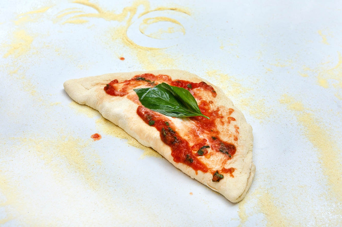 6. Now fold the calzone by taking the edge of the dough without the toppings and fold it over the one with the toppings. Press the edges together, pinching them on both sides to ensure the calzone is well sealed. Be careful not to break the dough at this stage, as this will spill all the filling out. With a sharp knife, cut a hole in the top centre part of the calzone, so the steam can escape during cooking. Now spread on the open cut a tablespoon of the tomato sauce all around, top with some grated Parmesan or Pecorino cheese and a few cubes of fresh mozzarella. Finish with one basil leaf dipped in water (so it doesn’t burn) and place on top of the open cut.