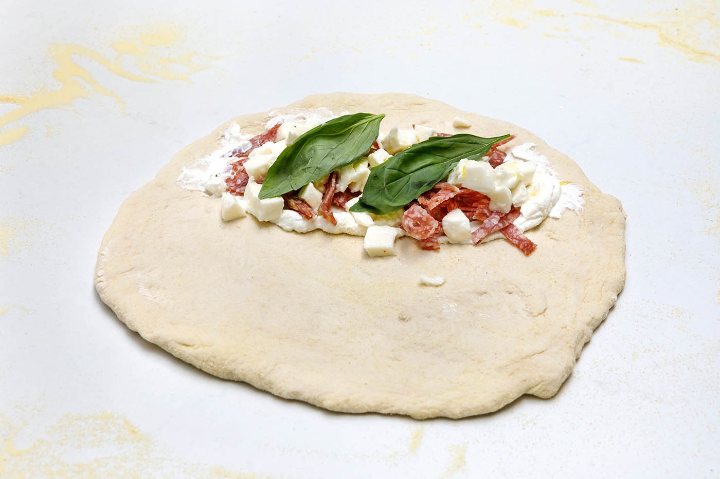 5. Start by spreading a thin layer of ricotta cheese, on one side of the calzone base leaving 2.5cm around the edge so you can seal the calzone. Sprinkle over some sliced salami Napoli, then add some cubes of mozzarella cheese and a couple of basil leaves slightly ripped into smaller pieces and a drizzle of extra virgin olive oil.