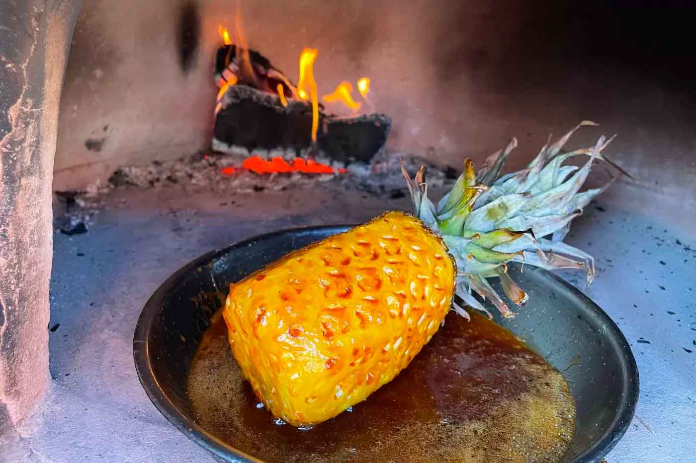 Who says you cannot make desserts in a wood-fired oven? This is a great dinner party treat that provides theatre to your table. A whole pineapple roasted in caramel flavoured with spices and rum, hand-carved at the table and served with a dollop of vanilla ice cream.