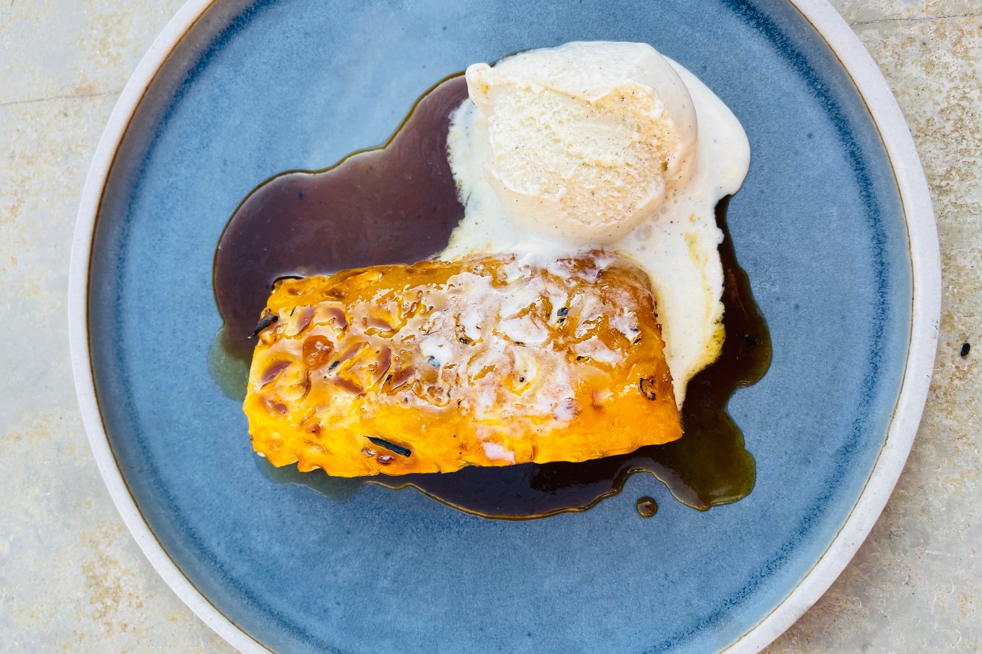 6. Place one piece of pineapple onto warm plates, spoon the caramel sauce over it and serve with a scoop of vanilla ice cream.