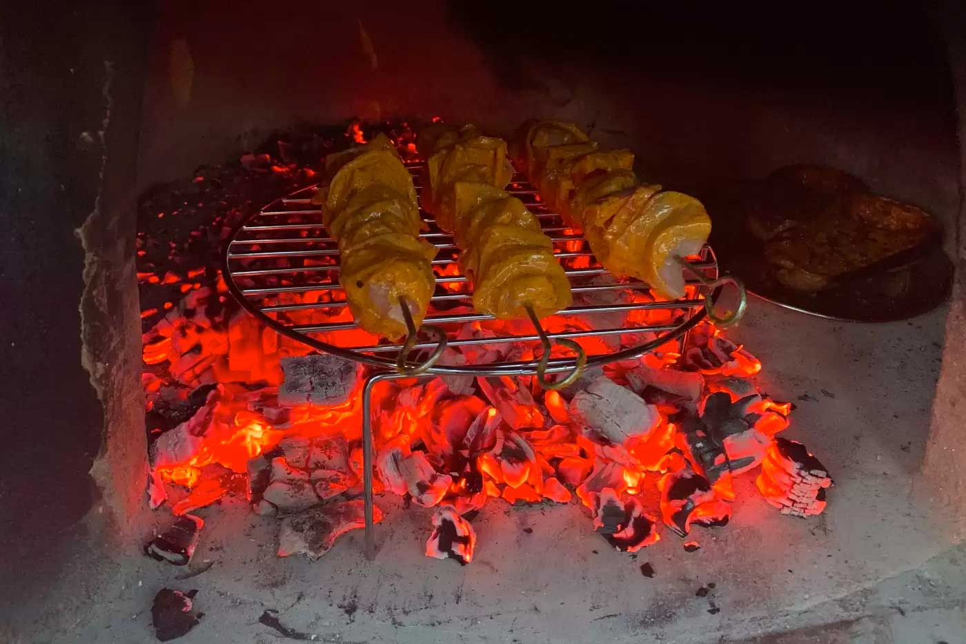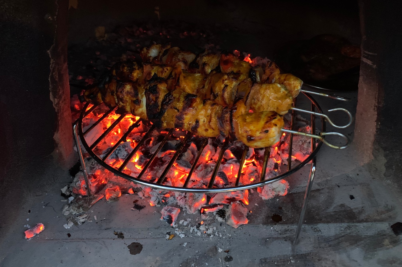 Learn how to make and prepare the most delicious spicy chicken skewers barbecued over hot coals in your wood-fired oven. The marinade is made from a tangy blend of yoghurt, garlic, spices and fresh lemon juice for the ultimate wood-fired chicken skewer.