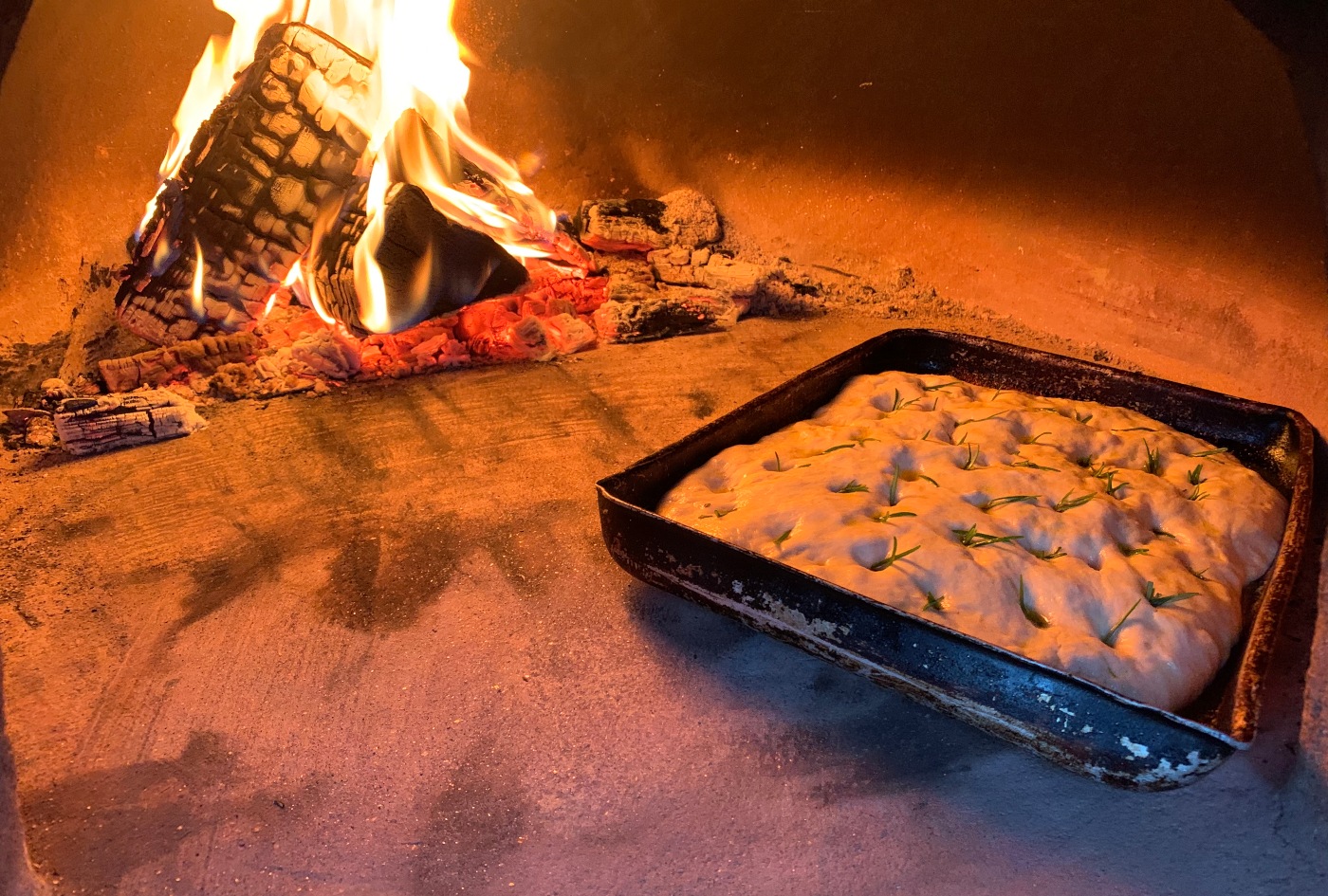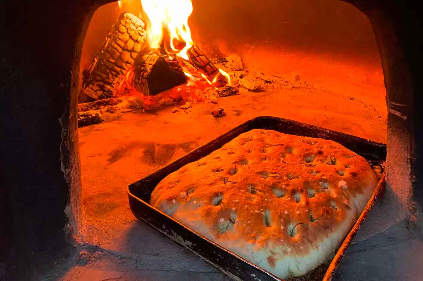 Crispy, salty crust with a fluffy centre, nothing is more rewarding than a freshly baked focaccia bread coming out of a wood-fired oven. The secret? Spray some water in the oven chamber to create some steam and puff the dough up.